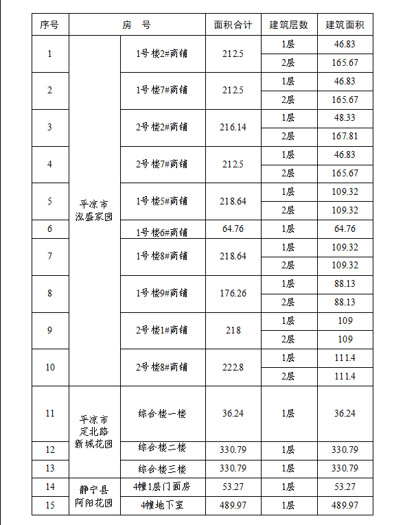 2020-12-15平?jīng)鲢垂I(yè)投資發(fā)展有限責(zé)任公司現(xiàn)有位于平?jīng)鍪嗅轻紖^(qū)十里鋪泓盛家園的商鋪、崆峒區(qū)定北路綜合樓及靜寧縣阿陽(yáng)花園地下室,現(xiàn)對(duì)外公開(kāi)出租。具體情況公告如下∶一、出租房屋基本情況二、房屋出租期限及租金∶按上述房屋基本情況,房屋出租期限及租金面議。三、租賃合同